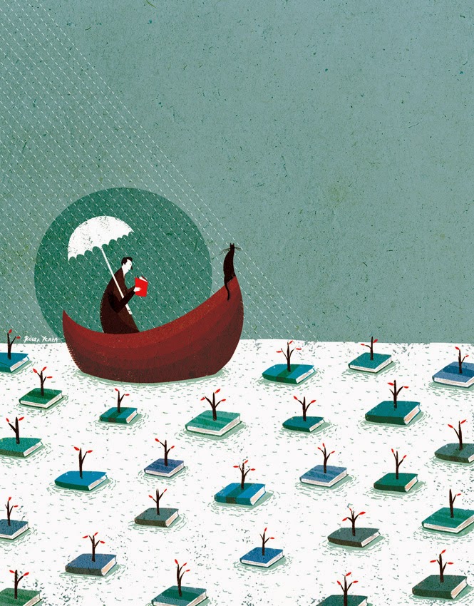 “Navegando entre libros”, ilustración de Roger Ycaza (Ecuador).